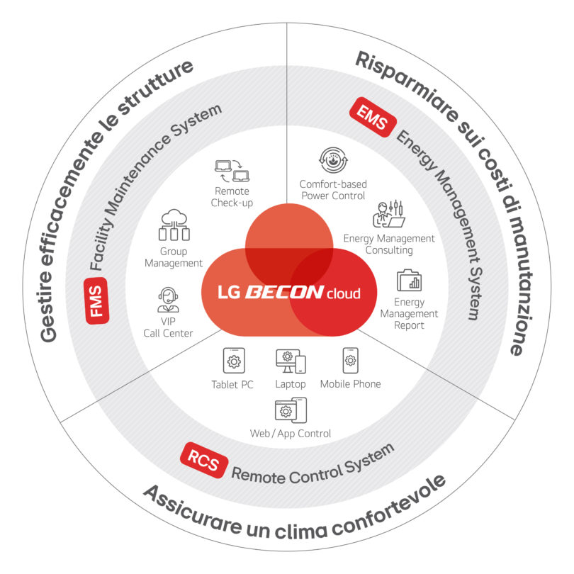 Con le sue funzionalità avanzate e la capacità di ottimizzare l’intero ciclo di vita degli impianti, LG BECON™ Cloud rappresenta la soluzione ideale per uffici, edifici residenziali, hotel, spazi di coworking, catene retail e centri commerciali. Grazie alla manutenzione predittiva e alla gestione remota, permette alle aziende di ridurre gli sprechi, contenere i costi e garantire un comfort costante in ogni contesto.